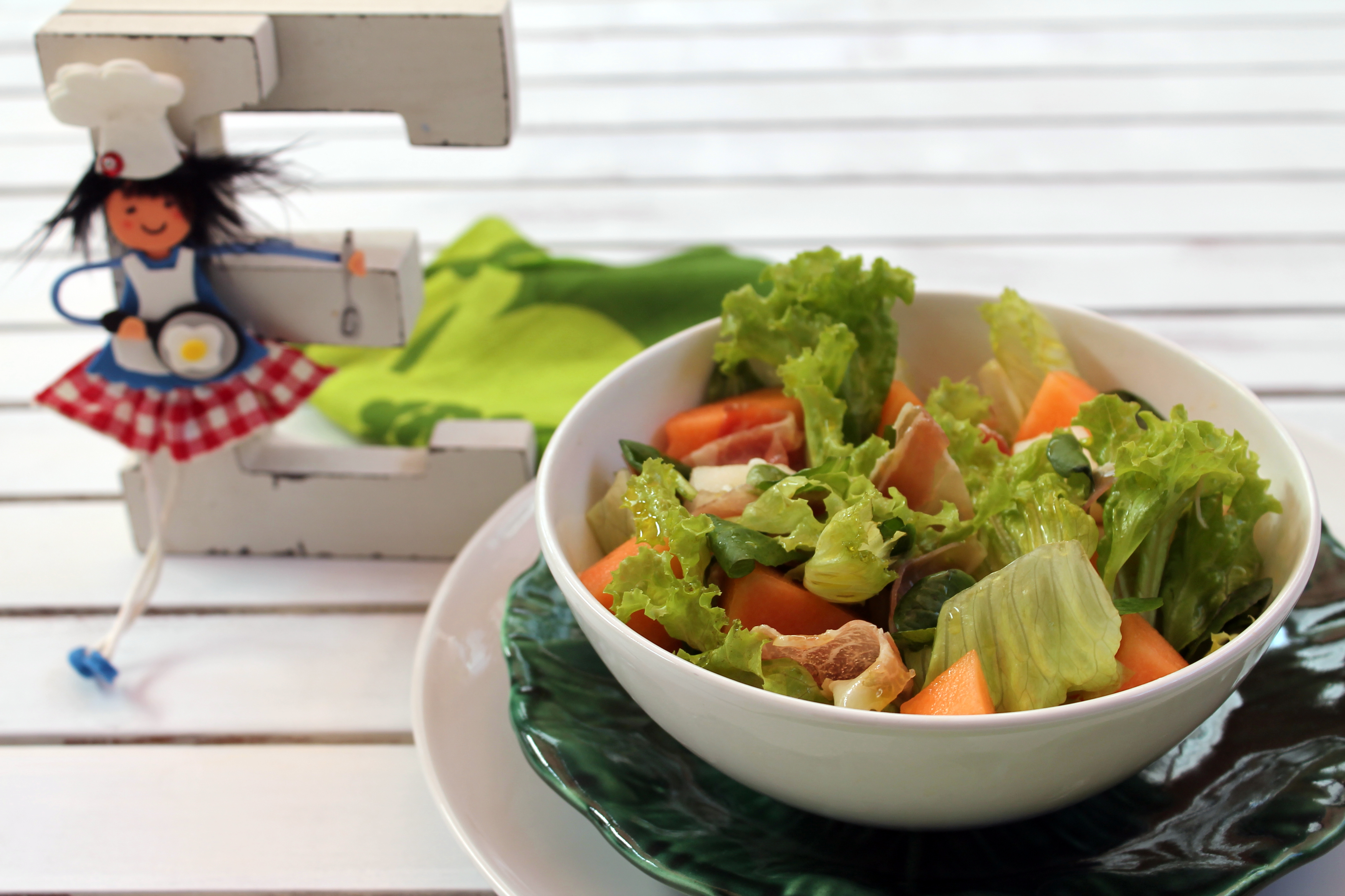 Es una variación del clásico melón con jamón. Y también es un buen recurso para cuando te queda poco melón, porque lo aumentas con la lechuga.