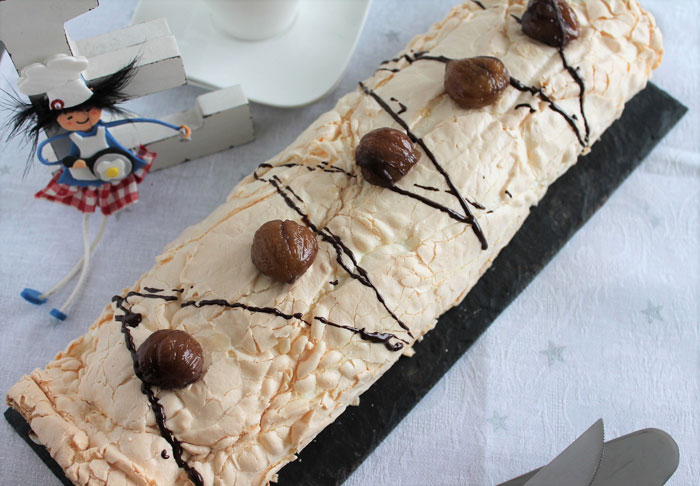 Separa el bizcocho de merengue del silpat o papel y colócalo sobre un paño de cocina. Unta la plancha con una primera capa de nata montada y haz una segunda con la crema de castañas y chocolate. Ayudándote del paño ve envolviendo el brazo con cuidado para que no se rompa.
