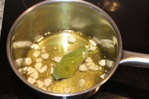-Mientras prepara el escabeche; en un cazo calienta el aceite, añade los ajos laminados y fríelos ligeramente —es importante que no se te quemen porque aportarían un desagradable sabor amargo—, y las hojas de laurel. Cuando los ajos hayan cogido un leve color dorado incorpora la pimienta, el clavo y apaga.