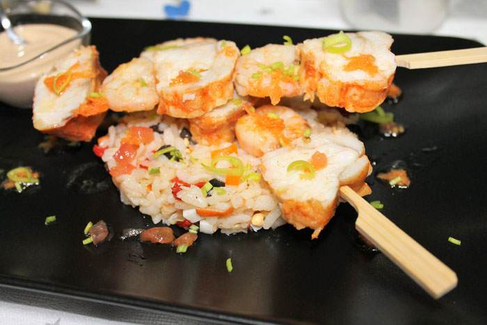 Con la ayuda de un aro o una taza emplata el salpicón y apoya encima las brochetas —yo he puesto dos por persona—. En la mesa pon las salsas para que cada una se sirva la que quiera. ¡ y Éxito seguro! (Me ha quedado un primer plato bastante completo, además servidas así son un buen recurso para cuando hay mucha gente).