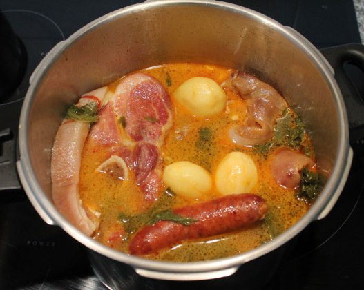 A los 20 o 25 minutos comprueba el punto de las patatas y cuando estén bien cocidas ya puedes dar el plato por finalizado. Comprueba también el punto de sal y rectifica si en necesario. Apaga el fuego y deja que repose todo en la olla hasta la hora de comer. (Si habías retirado el lacón o la cacheira porque ya estaban cocidos, ahora es el momento de integrarlos con el resto de la preparación para que se calienten).