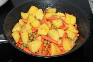 -En una sartén limpia pon una cucharada de mantequilla con dos o tres de aceite de oliva, cuando este caliente incorpora las patatas y las zanahorias —si utilizas las zanahorias congeladas debes añadirlas más tarde, junto con los guisantes—. Agrégales la sal, romero y tomillo. Saltéalas durante un rato. Espera a que la patata coja una capita crujiente para reducir el fuego y tápalas. Remueve de vez en cuando. A los diez minutos, más o menos, añade los guisantes. Rehoga durante unos minutos más y reserva.