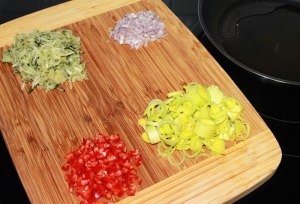 – Lava los puerros y córtalos en rodajas finas. Pica mucho la chalota y el pimiento, pela el calabacín y rállalo o córtalo también en trocitos pequeños.