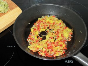 – En tres o cuatro cucharadas de aceite saltea primero la chalota y el pimiento, que son más duros. Después de unos cinco minutos de cocinado incorpora el puerro, revuelve con frecuencia para que no se queme, y al ratito el calabacín. Añade sal, pimienta y deja que se cocinen las hortalizas hasta que estén blandidas.