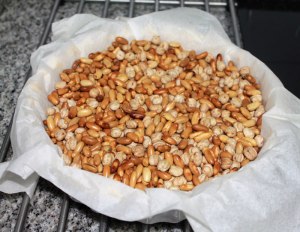 – Saca el molde con la masa del congelador. Antes de meterlo en el horno deberás cubrir con papel la base y esparcir encima unos garbanzos o habas secas para que hagan peso y evitar que se deforme con la cocción (el papel es para retirar las legumbres después con facilidad). Hornea durante 12/15 minutos, a 160º/180ºC si utilizas aire y 180º/200ºC sin aire, en la parte del horno de la mitad hacia abajo. Transcurrido este tiempo retira el papel con las legumbres y deja que la base se enfríe —no tiene que quedar demasiado dorada—