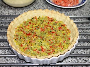 – Engrasa un molde para quiche, o ponle papel sulfurizado si luego la vas a desmoldar, coloca encima la masa quebrada estirada cubriendo fondo y laterales. Presiona bien las paredes para que se ajuste a la forma del molde y no se deforme con la cocción. Recorta los bordes con un cuchillo afilado, si quieres puedes hacer algún adorno con la masa sobrante, pero sin que sobresalga demasiado porque lo más probable es que se rompa durante la cocción. Pincha con un tenedor toda la base y deja el molde en el congelador una media hora. Deberá estar muy fría cuando la metas en el horno. (Aquí puedes ver la receta de masa quebrada con más detalle).