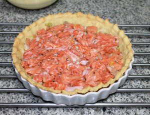 – En un cuenco amplio bate los huevos con la leche, la nata, la nuez moscada, la sal y el queso rallado, si es que has decidido utilizarlo. Coloca sobre la base de la tarta, una vez fría, una primera capa con el sofrito, también frío. Cúbrelo con los trozos de salmón y vierte por encima la mezcla de los huevos.