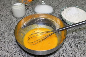 – En un bol grande bate con unas varillas los huevos, el azúcar y la pizca de sal.