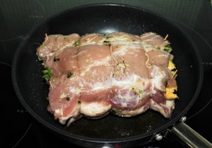 – Dora el rollo de lomo en una sartén con muy poco aceite de oliva y colócalo en una fuente que pueda ir al horno.