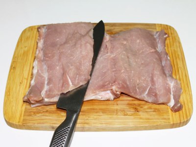 – Corta el lomo en forma de libro — cuando lo compres puedes pedir en la carnicería que te lo hagan ellos y así te ahorras el trabajo, pero de todas formas es muy fácil—. Mira la pieza y divide mentalmente el lomo en tres capas horizontales, apoya el cuchillo en la primera linea imaginaria y corta a lo ancho la primera capa, sin llegar al final. Abre y gira toda la pieza —el giro es para facilitar el manejo del cuchillo— Donde has acabado el primer corte empieza a hacer el segundo, profundiza un poco con el cuchillo y corta por la segunda linea imaginaria para conseguir la otra capa, deja de cortar antes de llegar al final.
