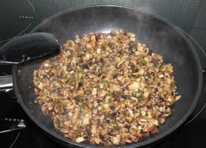 – Pica mucho la cebolla y el pimiento. Saltéalos en un poco de aceite durante unos minutos, añádeles sal y baja el fuego. Cuando la cebolla esté blandita añade los champiñones, también troceados. Deja que se cocine todo unos cinco minutos.