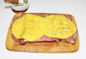 – Bate los huevos con una pizca de sal para hacer dos tortillas planas. Colócalas solapadas encima del lomo abierto.