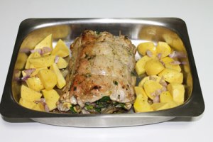 Pela, corta las patatas en trozos no muy pequeños y ponlas en la fuente con el lomo.Trocea la cebo- lla y añádela sobre las patatas, salpimienta. Cuece a 180º de 1 hora a 1 hora y cuarto. A los 20 minutos de cocción, riega la carne con medio vaso de vino. Mueve de vez en cuando las patatas y da la vuelta también al rollo. Cuando apagues deja que repose el asado unos diez minutos dentro del horno.