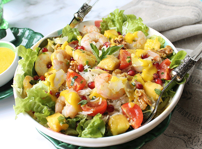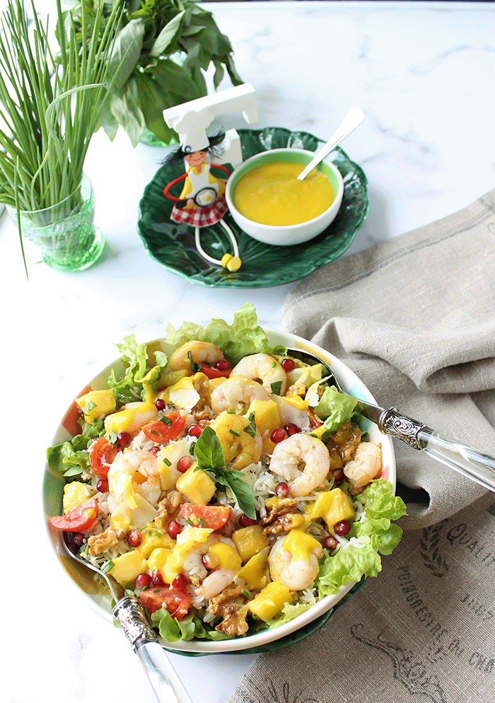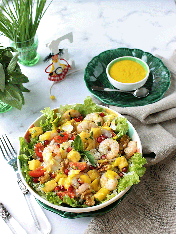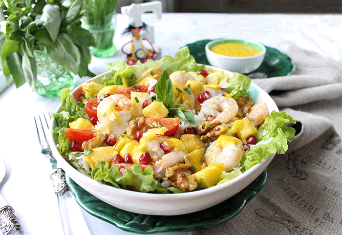 Esta ensalada que te propongo hoy de langostinos, mango y granada cumple estas condiciones. Jugando con la combinación de estos pocos ingredientes disfrutarás de una ensalada completa, deliciosamente fresca y dulce. Al llevar arroz puede ser un primer plato, e incluso lleva todos los nutrientes necesarios para ser un plato único.
