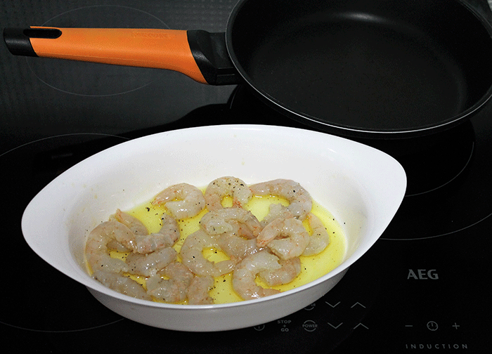 - En un plato o fuente pequeña pon un chorrito de aceite de oliva, añádele sal y pimienta. Coloca dentro los langostinos para que marinen.