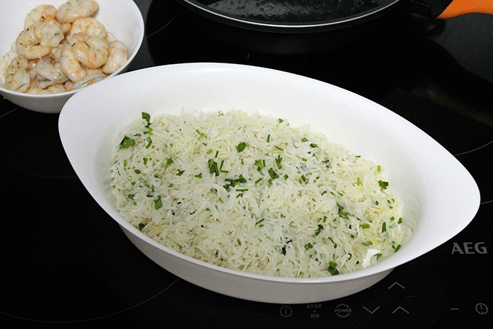 - A este aceite de freír los langostinos añádele —cuando haya enfriado un poco— el cebollino y la albahaca picados. Después riega el arroz ya cocido con este aceite y revuélvelo para repartirlo bien.