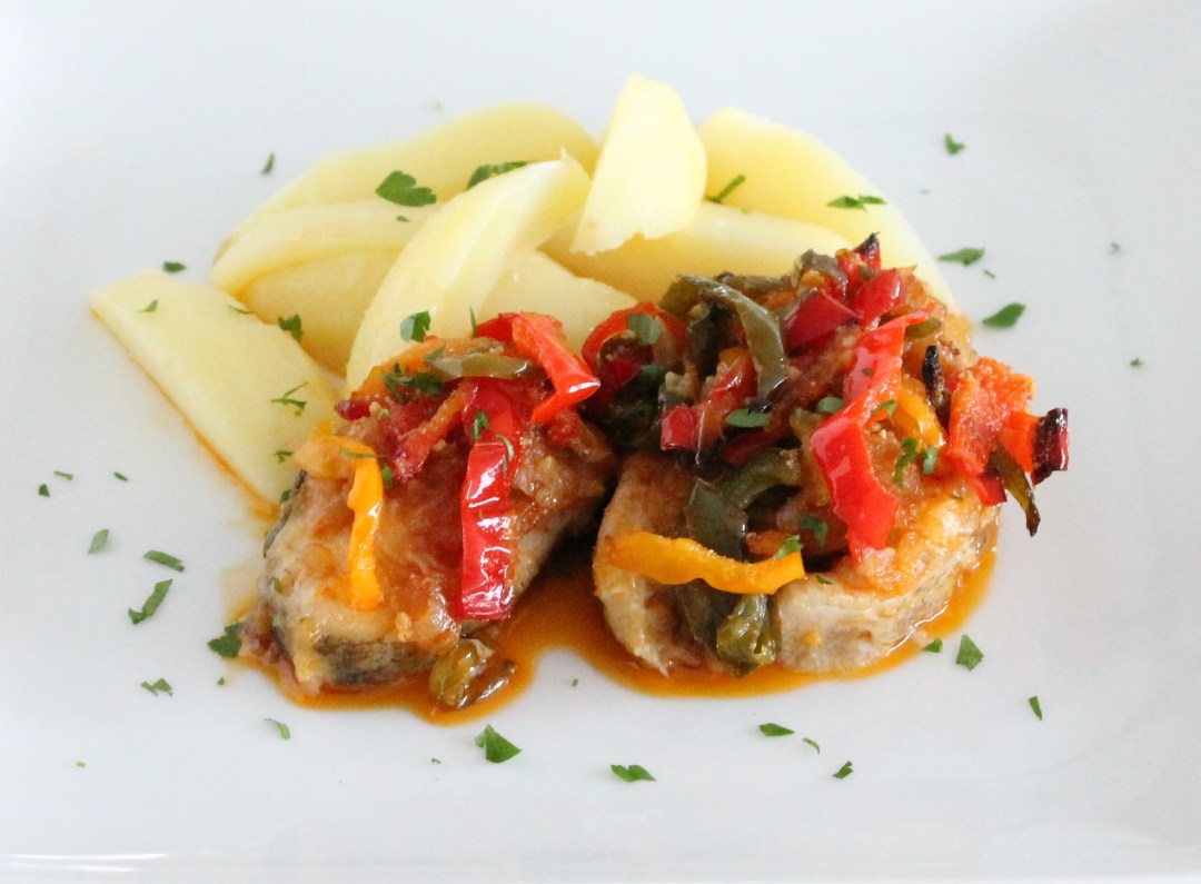 Necesitas: Una rosada de 1 k, más o menos350 g de pimientos en tiras (rojo, verde, amarillo)400 g de cebolla cortada en plumas delgadas1 cucharada de pimentón dulceSal y aceite de oliva½ vaso de vino de blanco (Oporto sería ideal)100 g de harina para rebozar el pescado3 o 4 patatasPerejil El de hoy es un … Sigue leyendo Rosada a la portuguesa