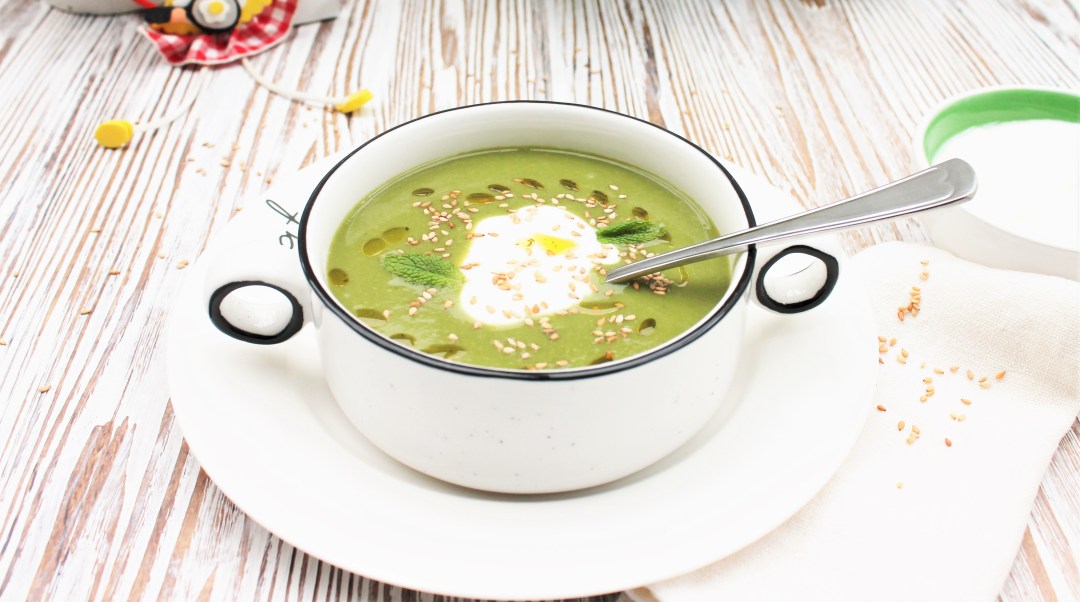 Necesitas: 350 g de guisantes congelados100 g de espinacas frescas250 g de patatas100 g de puerros30 g de chalotas o cebolla600 ml de caldo de verduras (o agua)Hierbabuena, sal y pimienta20 ml de aceite para rehogar las hortalizas Para adornar: yogur griego, semillas de sésamo tostadas, aceite de hierbabuenaPara el aceite de hierbabuena: 100 ml … Sigue leyendo Crema de guisantes con espinacas e hierbabuena