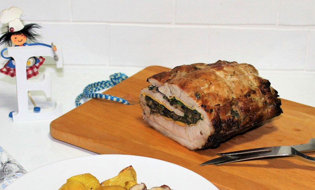 Rollo de lomo relleno de espinacas y champiñones al horno